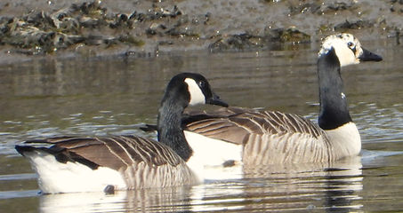 Left was part of a large flock on September 29, 2021. Right shows one with patchy white head caused either by leucism [loss of pigmentation] or breeding with a domestic goose. As it's in the wild I sway towards leucism. April 19, 2026. It was part of a trio, though species should have migrated in March